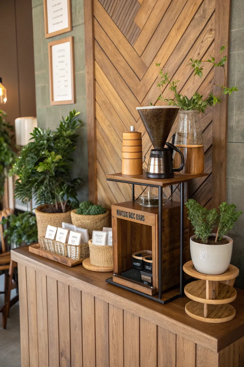 Bring nature indoors with plants and wooden touches for a warm coffee nook.