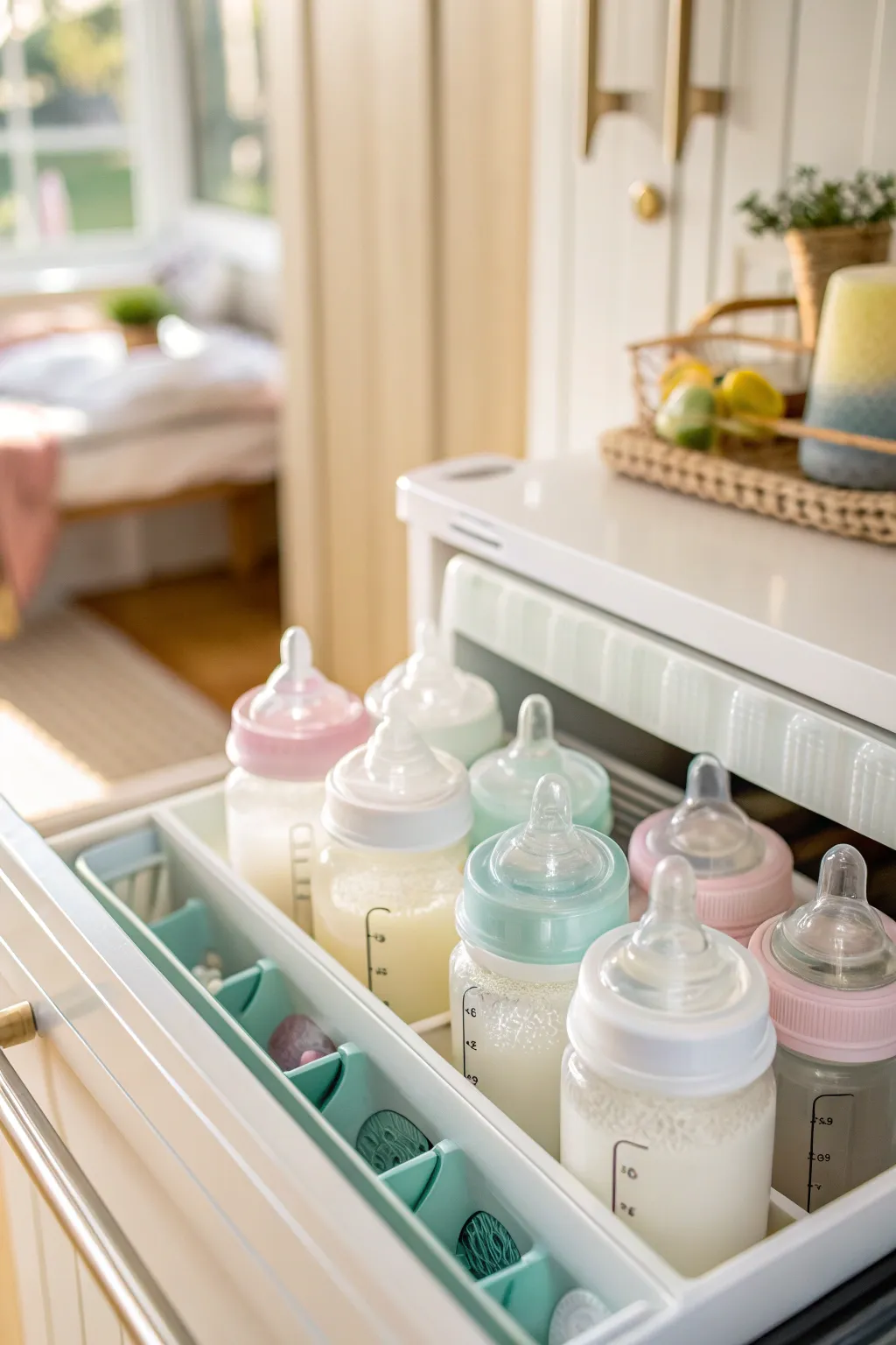 Consider transforming a kitchen drawer with adjustable dividers to create custom compartments for each baby bottle component. I love this approach for its simplicity and the way it keeps everything tucked away yet accessible.