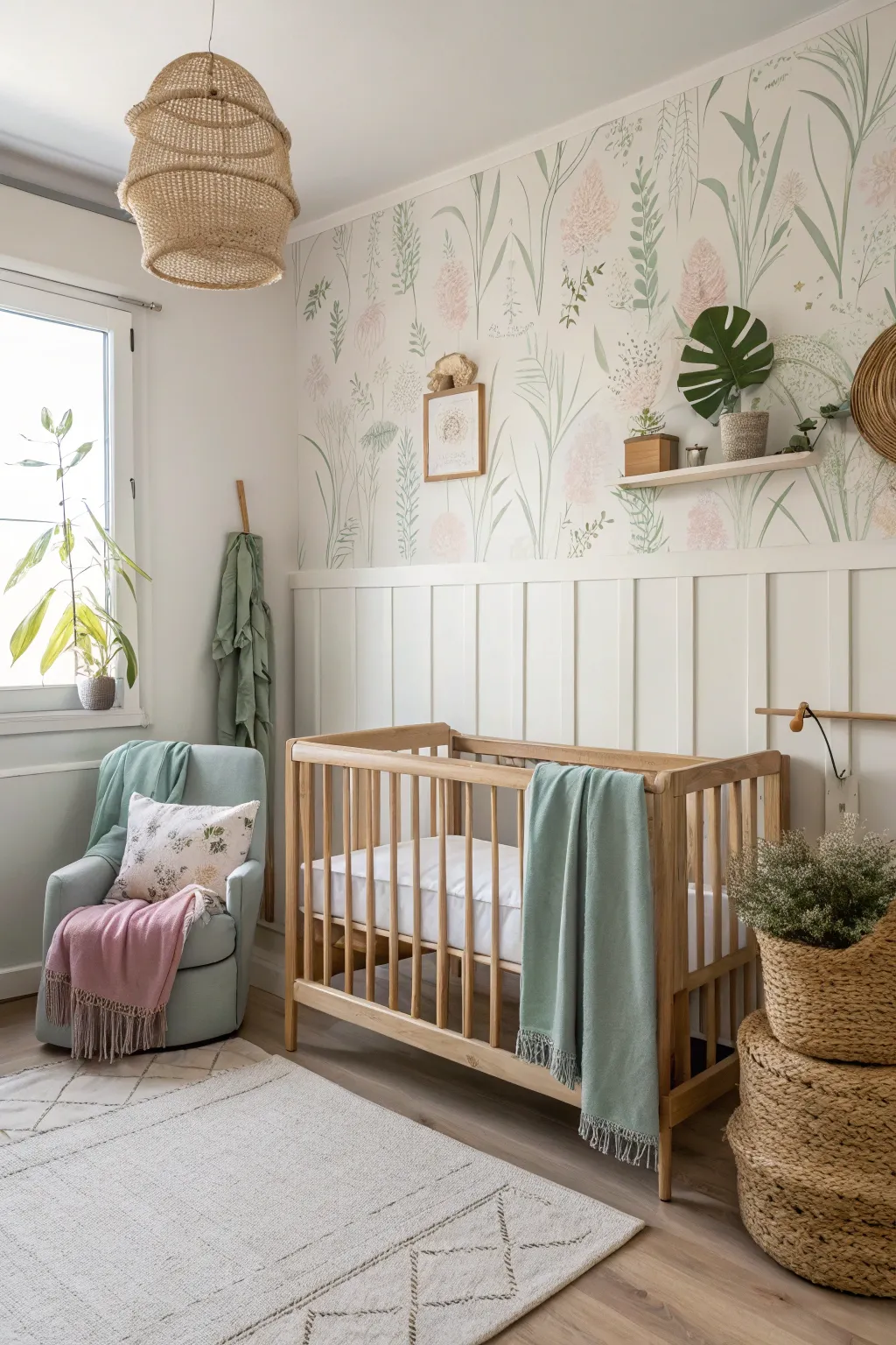 • Botanical Pattern Wallpaper: Add a natural touch to the nursery with calming botanical patterns. Enhance tranquility today.