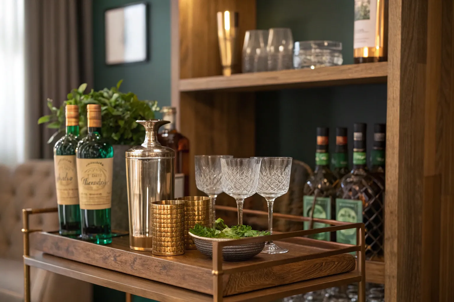 • Antique Bar Cart: Add charm and function to your setup with a vintage-inspired bar cart.