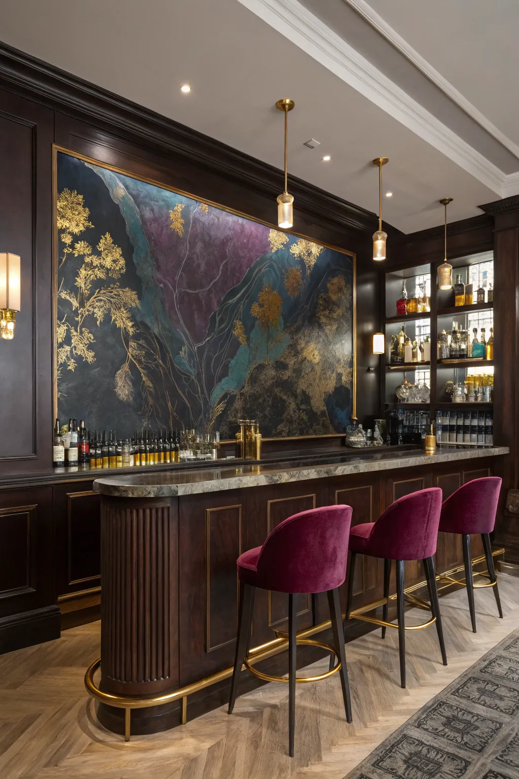 Elevate your bar nook with a custom mural that reflects your personal style. I love how a well-chosen mural can create depth and character, turning the nook into a visual masterpiece. 🎨 #ArtisticDesign #BarNook #HomeDecor