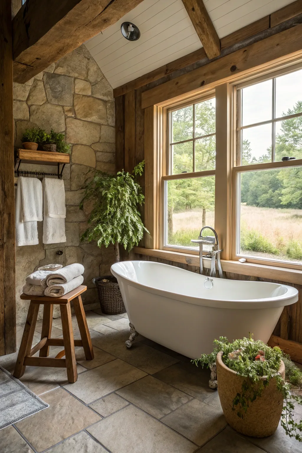 A freestanding tub, like a clawfoot, adds a luxurious touch to your rustic bathroom. I love placing them near a large window to connect with nature.
