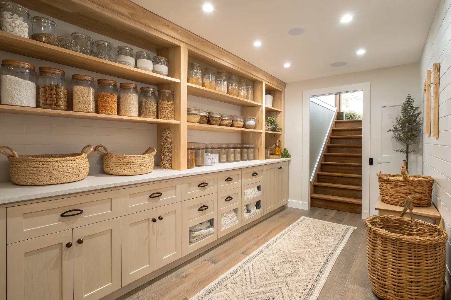 • Natural Fiber Bins: Use natural fiber bins to create a cozy and organized pantry space easily and stylishly.