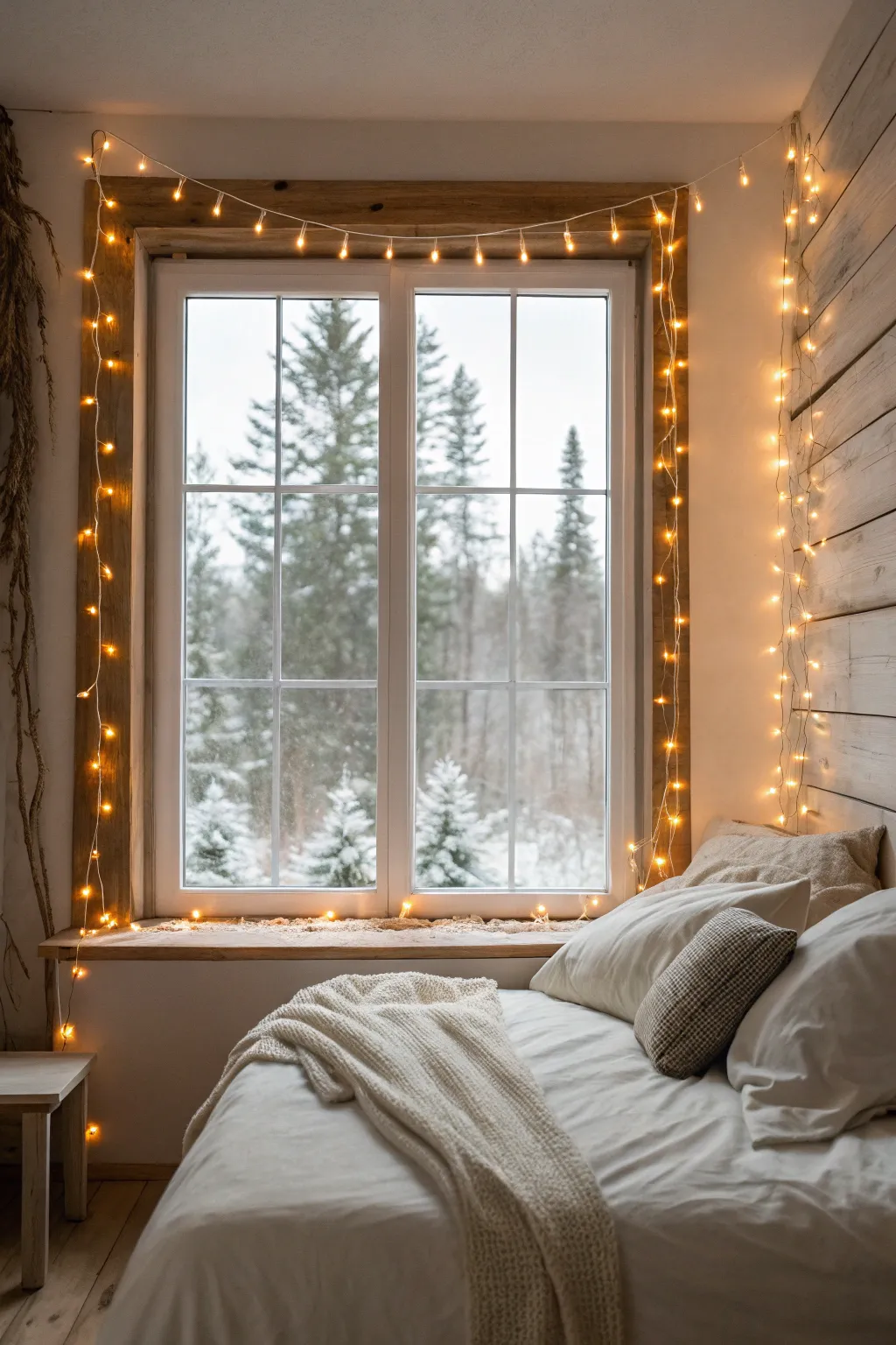 Outline your window with string lights to create a glowing frame. It’s an enchanting way to draw attention to your view.