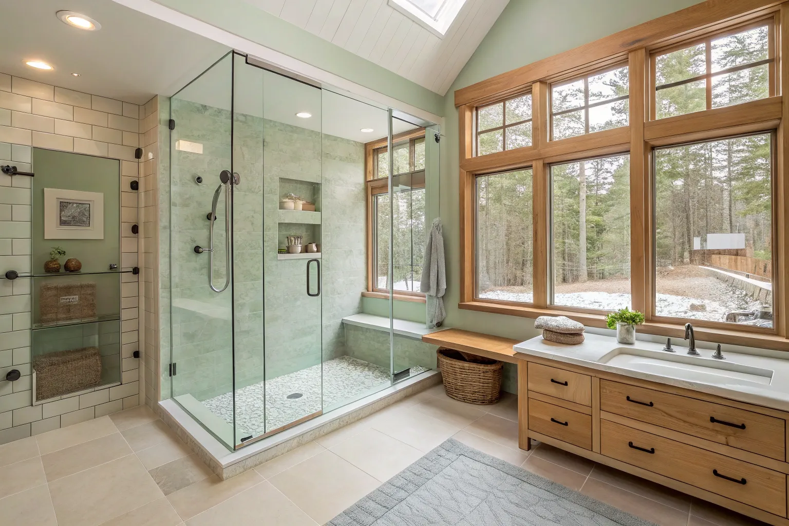Large windows or skylights let natural light flood into your shower, enhancing its atmosphere. In my designs, this element always adds a refreshing and energizing touch to the room.