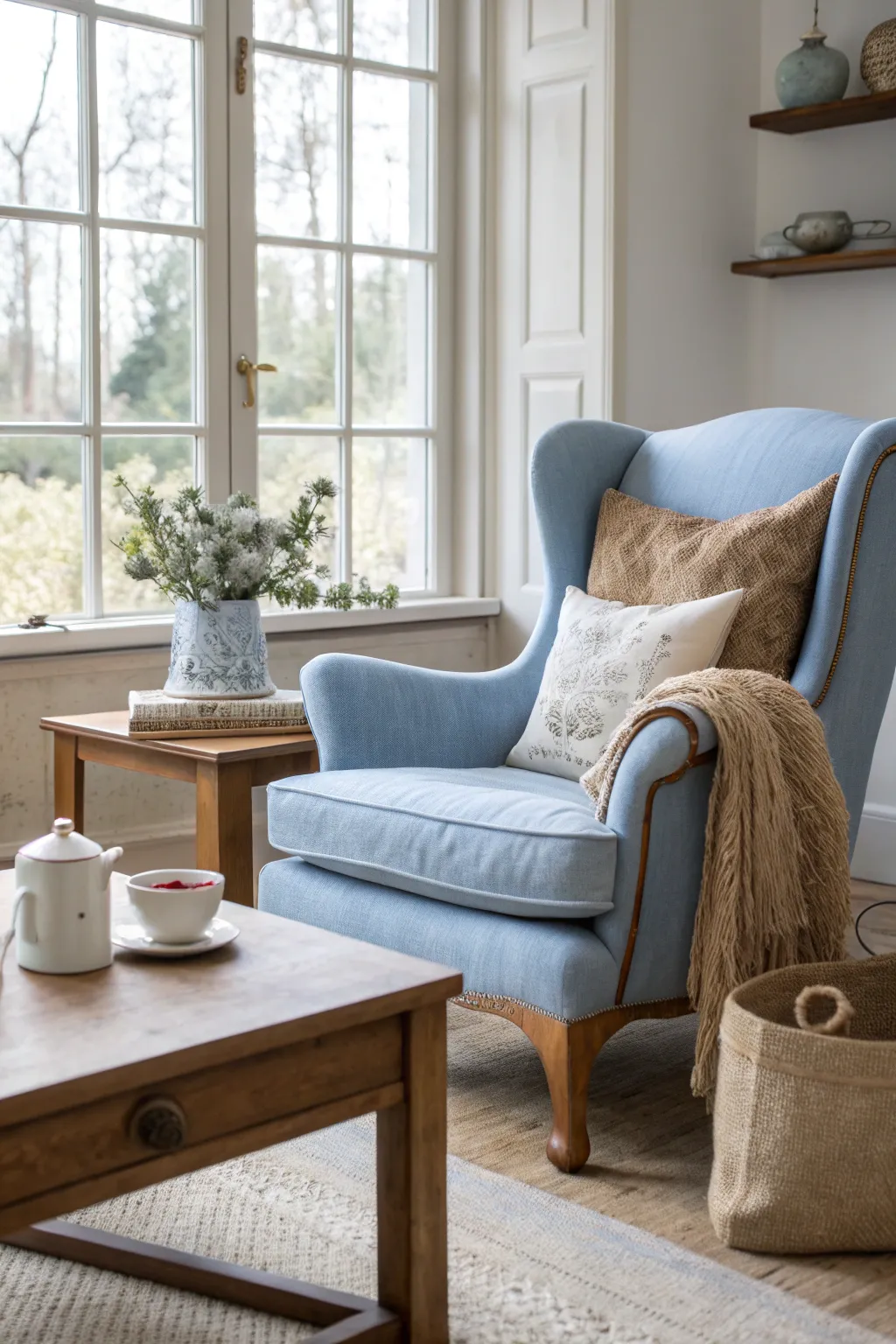 • Periwinkle Accent Armchair: Add elegance with a periwinkle armchair, bringing style and comfort to your living space.