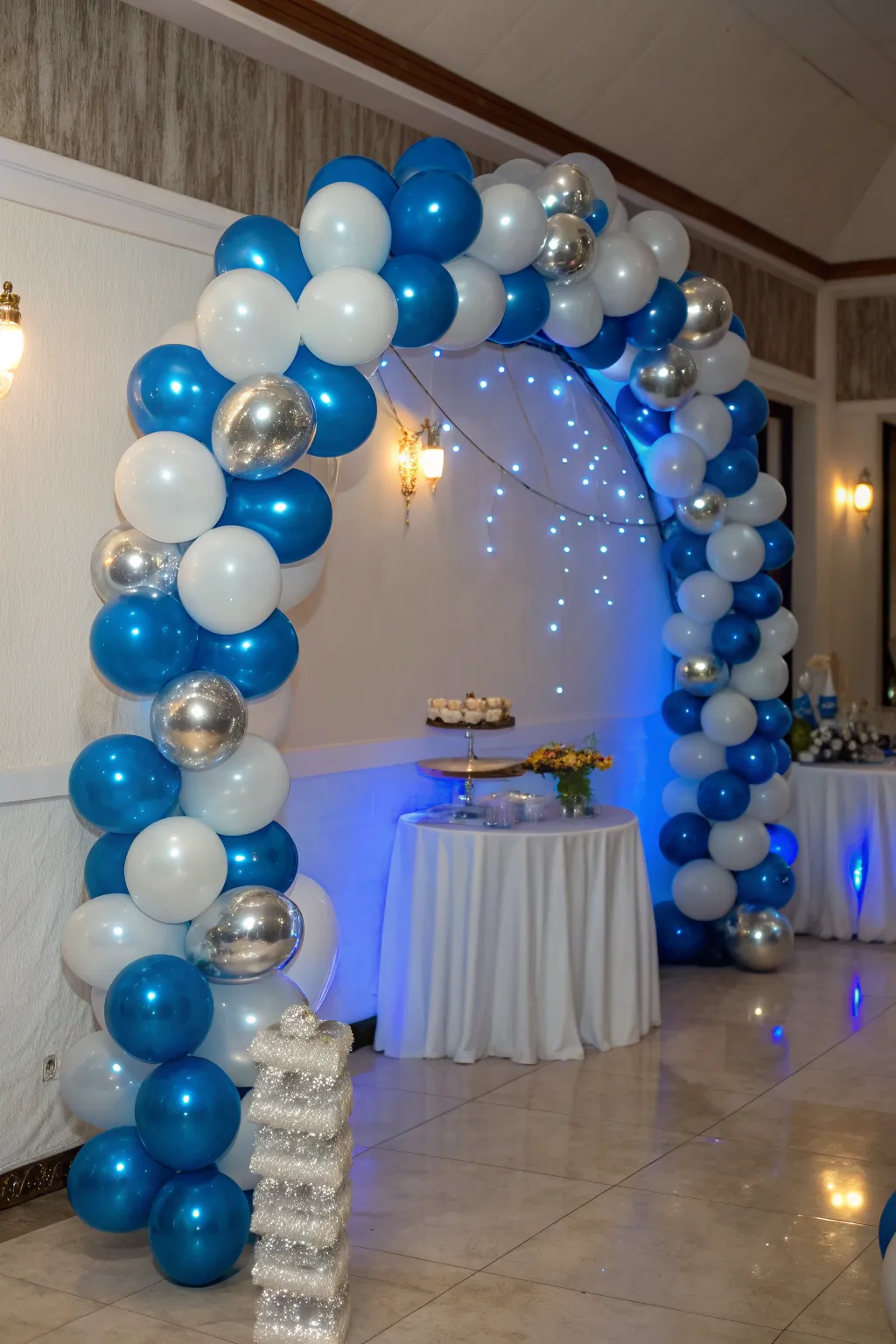 Start your party with a blue and white balloon display that guests will adore. I love adding a few metallic balloons for an extra touch of elegance.