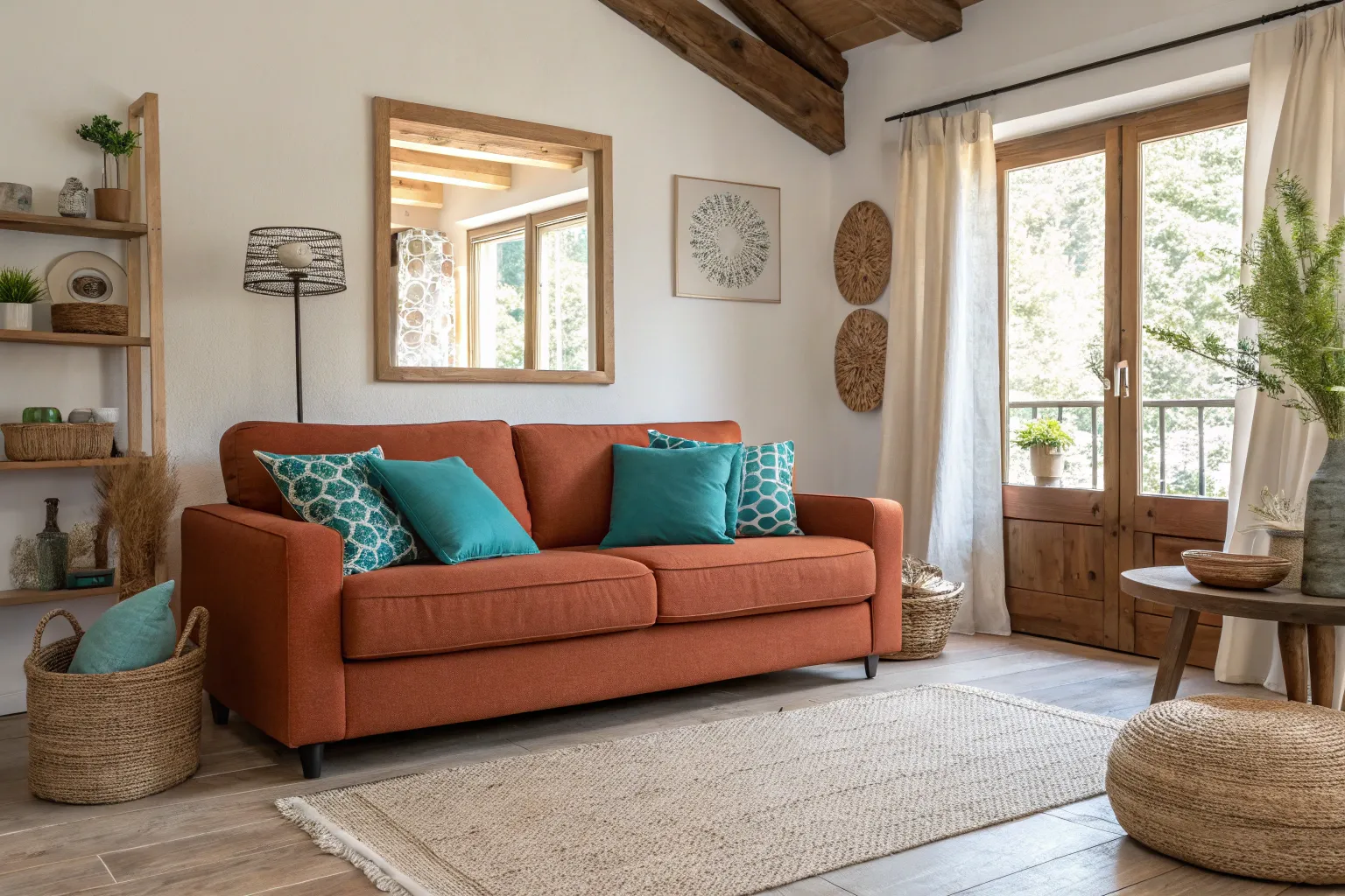Anchor your living room with a teal velvet sofa, which serves as a rich foundation for burnt orange accents. I once used this combination in a compact apartment, and it instantly added depth and luxury.