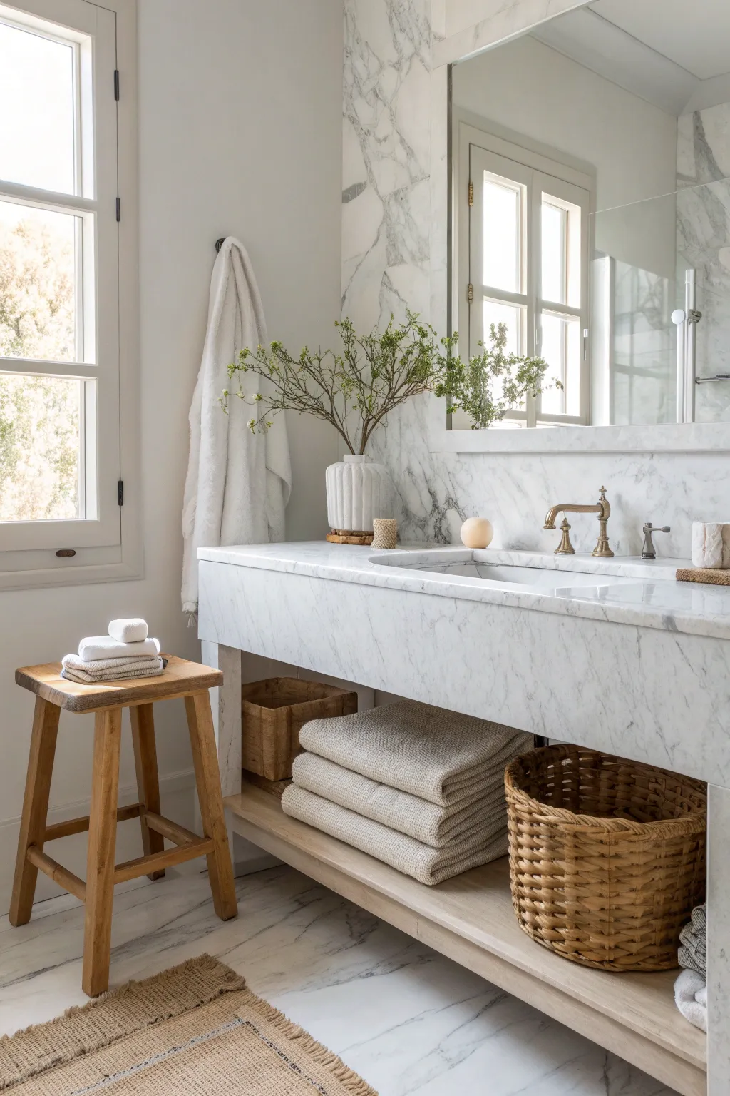 Introduce warmth into your marble bathroom with wooden accents. I’ve found that the contrast between wood and marble adds a cozy yet sophisticated touch.