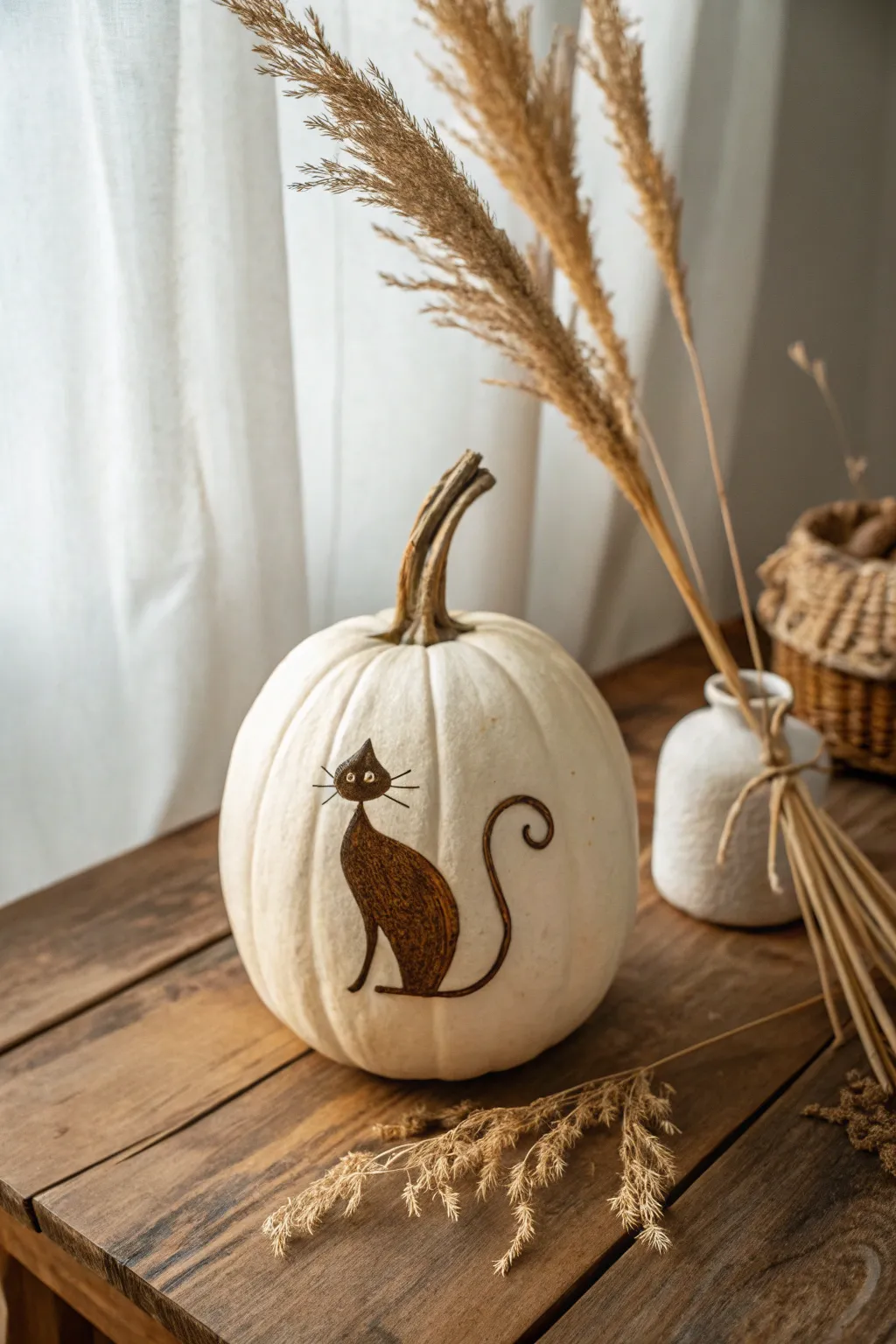 Pair your feline pumpkin with tinier pumpkins ornamented as rodents or avian creatures. This trio captivated everyone at my previous autumn gathering.