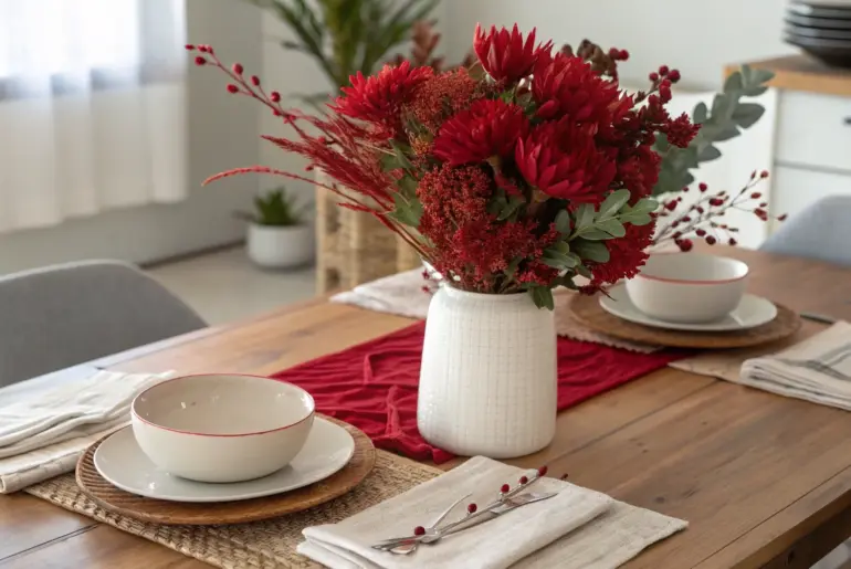 When it comes to home decor, a striking centerpiece can transform your space entirely. Let’s dive into some stunning red centerpiece ideas that are sure to elevate your home. Red Dahlias with Gold Accents Regal and festive, red dahlias with gold accents create a centerpiece that dazzles and delights. Combining red dahlias with gold accents creates a regal feel. It’s a stunning choice for a festive celebration or an elegant dinner. Possibly handy products: Gold…