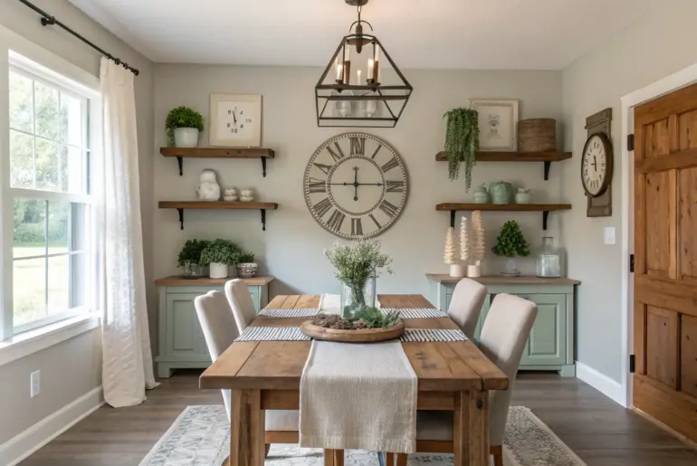 The modern farmhouse dining room is a harmonious blend of rustic charm and contemporary elegance. Let’s explore some creative wall decor ideas that will bring warmth and style to your space. Large Chalkboard A large chalkboard invites creativity and interaction, making it a fun family feature. 🖍️ #ChalkboardDecor #FamilySpace #CreativeHome Install a large chalkboard for a functional and playful decor piece. It’s perfect for notes, menus, or simply a creative canvas for your family. 🖍️…