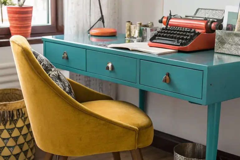 Mid-century modern design is a timeless style that perfectly blends functionality with aesthetics. Let’s explore some captivating ideas to bring this classic vibe into your home office. Incorporate Geometric Rugs A vibrant geometric rug infuses color and texture into this mid-century modern office space. A geometric rug not only adds visual interest but also softens the acoustics of your office. It’s a design trick I frequently use to pull a room together. 🏠 #MidCenturyVibes #OfficeInspo…