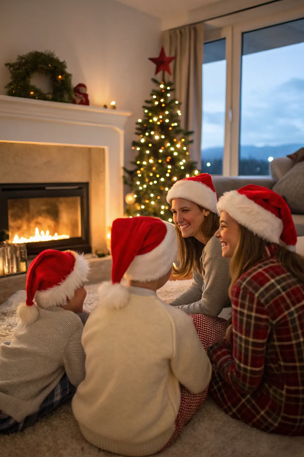 Add a bit of whimsy with Santa hats for everyone to wear. It’s a simple but delightful way to bring a smile and a touch of festive fun to the evening.