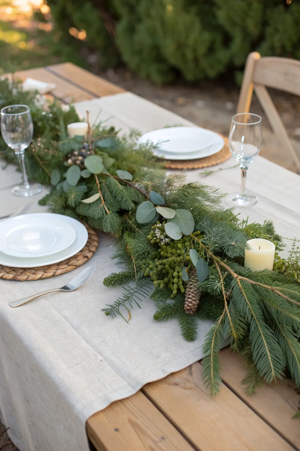 Bring the outdoors in with a table runner made entirely of natural greenery like pine branches and eucalyptus. It’s an eco-friendly way to add a fresh, aromatic touch to your table.