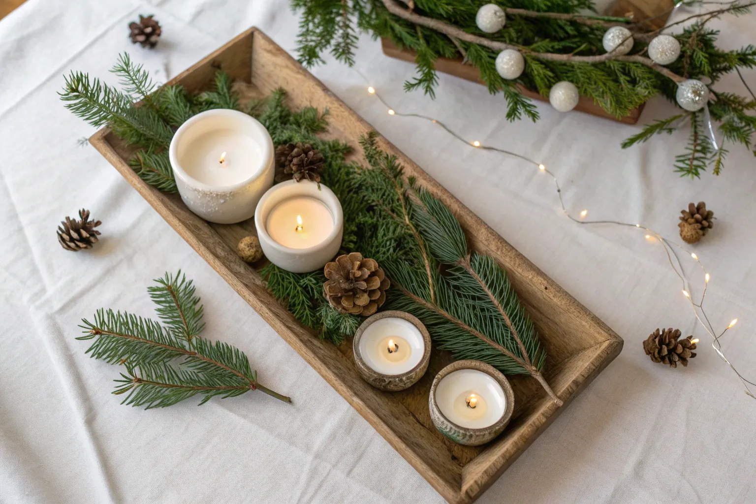 A wooden tray serves as the perfect base for your Christmas decor. Its natural texture complements the festive elements beautifully and keeps everything organized.