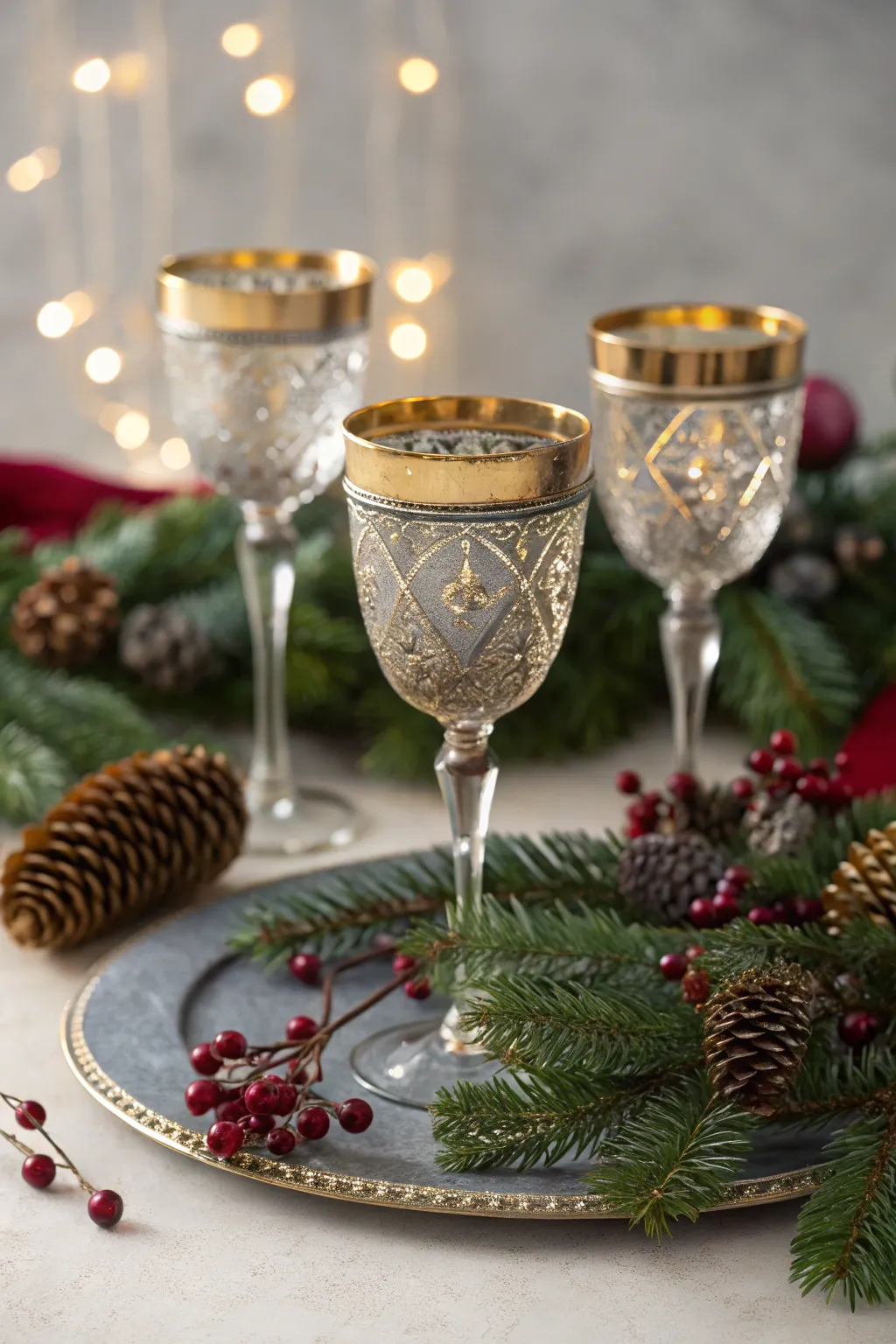 - Sparkling Silver Accented Frosted Glasses: Create a snowy effect with stylish frosted wine glasses accented by sparkling silver details.