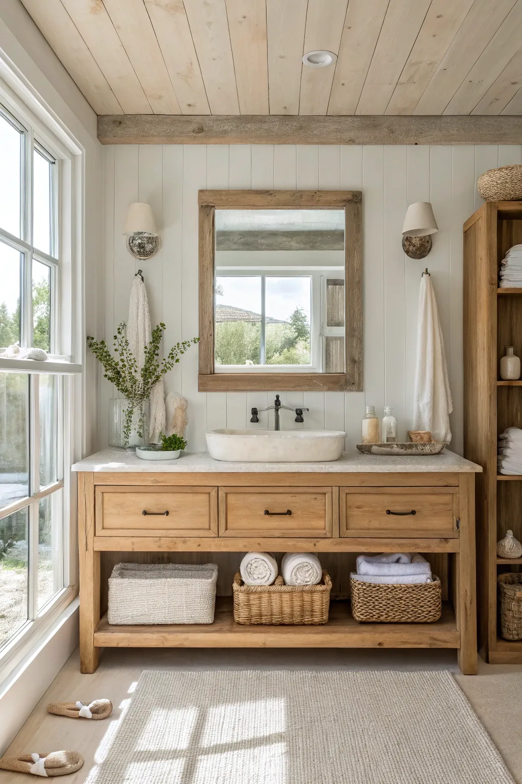 - Rustic Wood Ceiling Beams: Enhance your bathroom with rustic beams that bring a cozy seaside cottage feel.