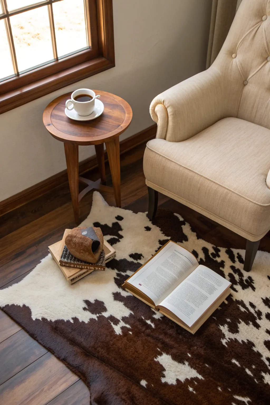 Create a warm and inviting reading nook by placing a cowhide rug under a comfy chair and lamp. It’s my go-to trick for carving out a peaceful retreat within a larger living space.