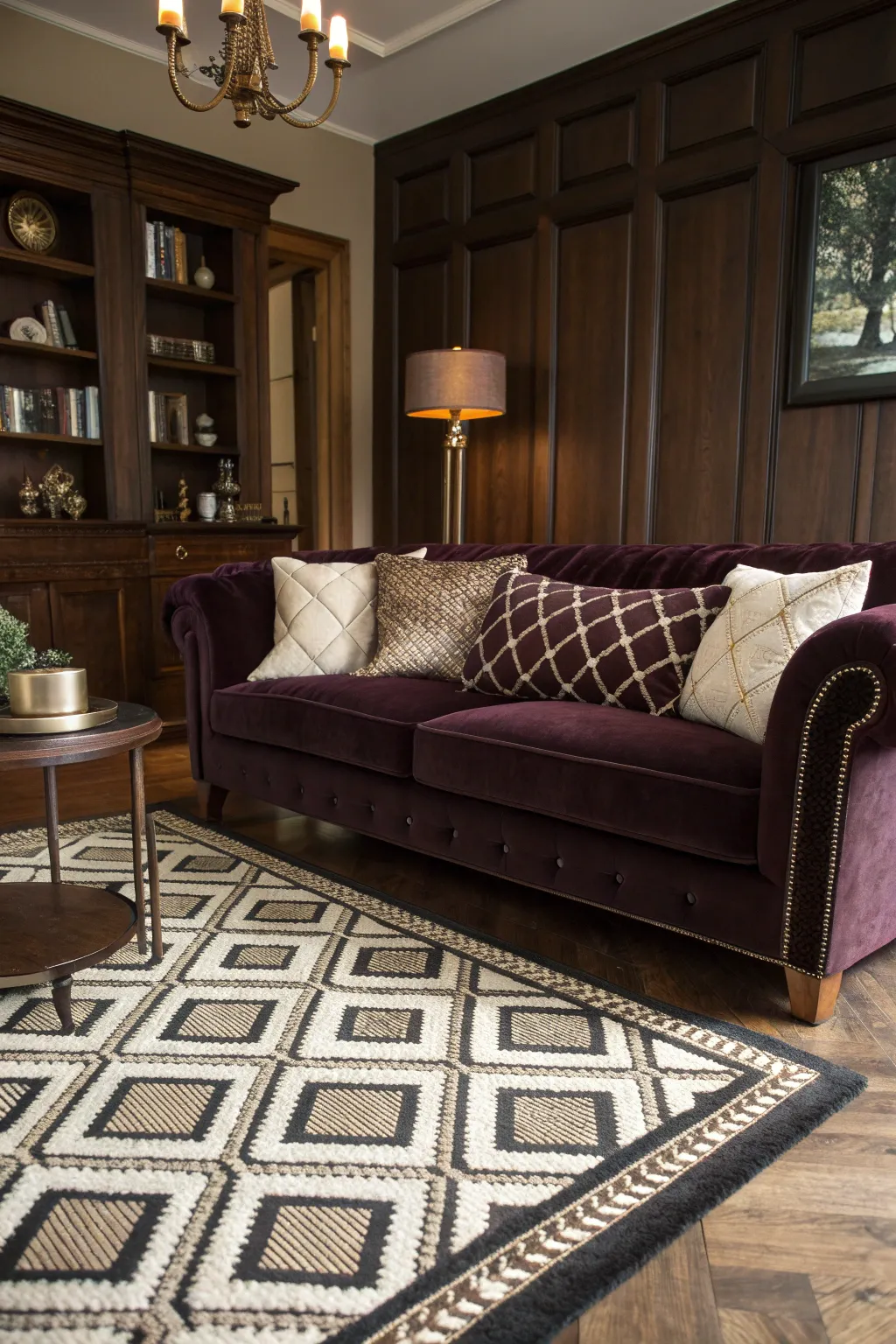 Add interest with geometric patterns through cushions or rugs. These patterns can break up the heaviness of dark furniture, providing a playful touch.
