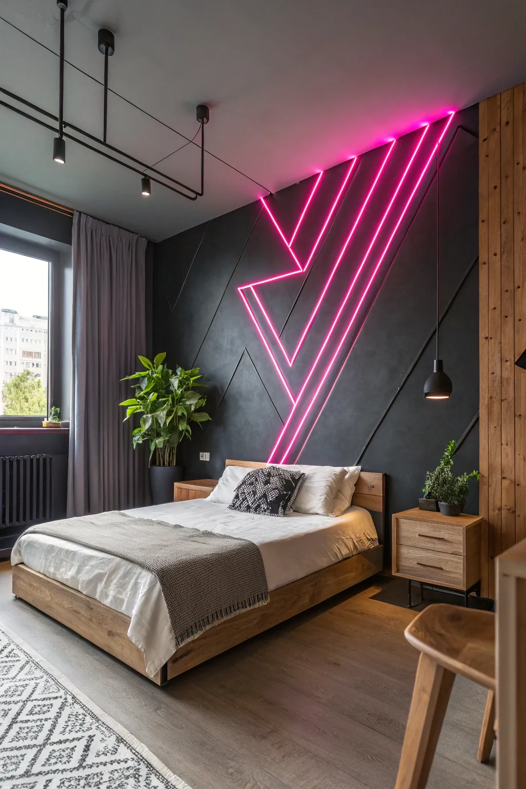 - Geometric Wall Decals: Add dimension and style with geometric wall decals complementing your neon accent lighting.