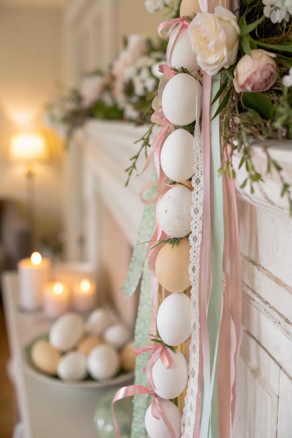 Create an elegant eggshell garland using cracked eggshells and pastel ribbons. It’s a sophisticated yet simple DIY project.