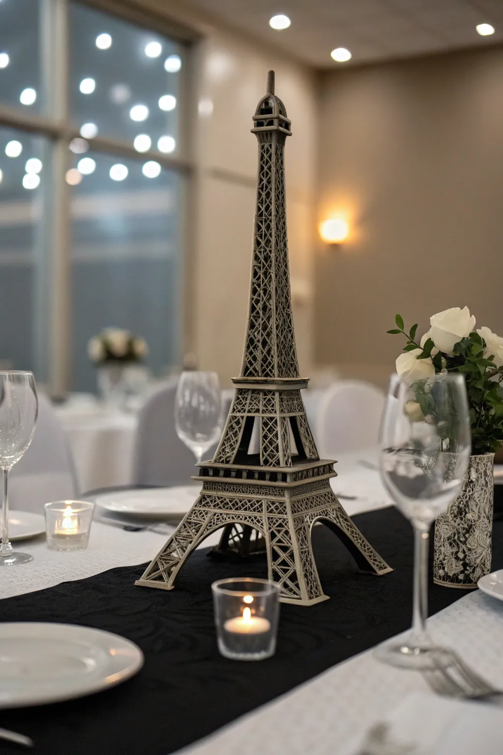 - Eiffel Tower Centerpiece Model: Elevate your décor with a stunning Eiffel Tower model, perfect for a Parisian themed evening.