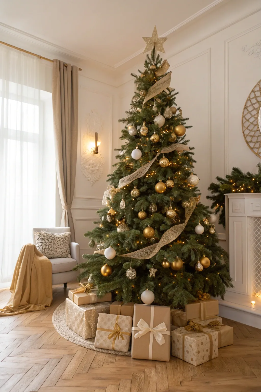 • Set of White and Gold Christmas Ornaments: Add elegance with white and gold ornaments for a minimalist, symmetrical tree display.