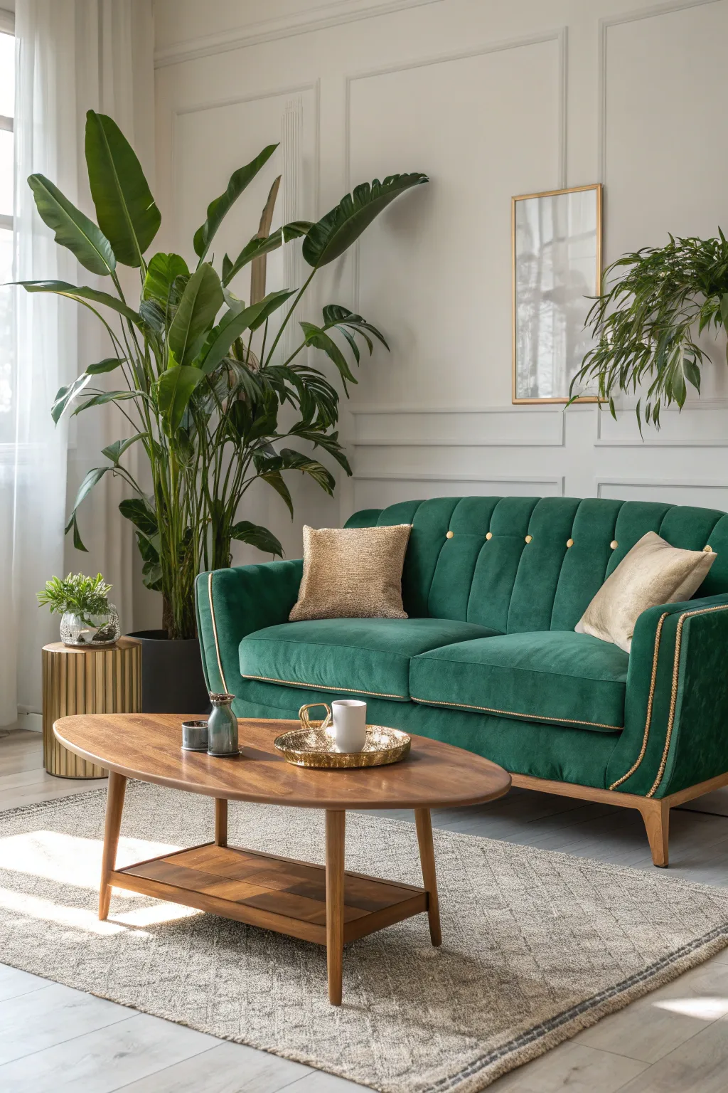 An emerald green velvet sofa can transform your living room into a luxurious haven. I love how this rich hue instantly becomes the centerpiece, drawing everyone in for a cozy chat.