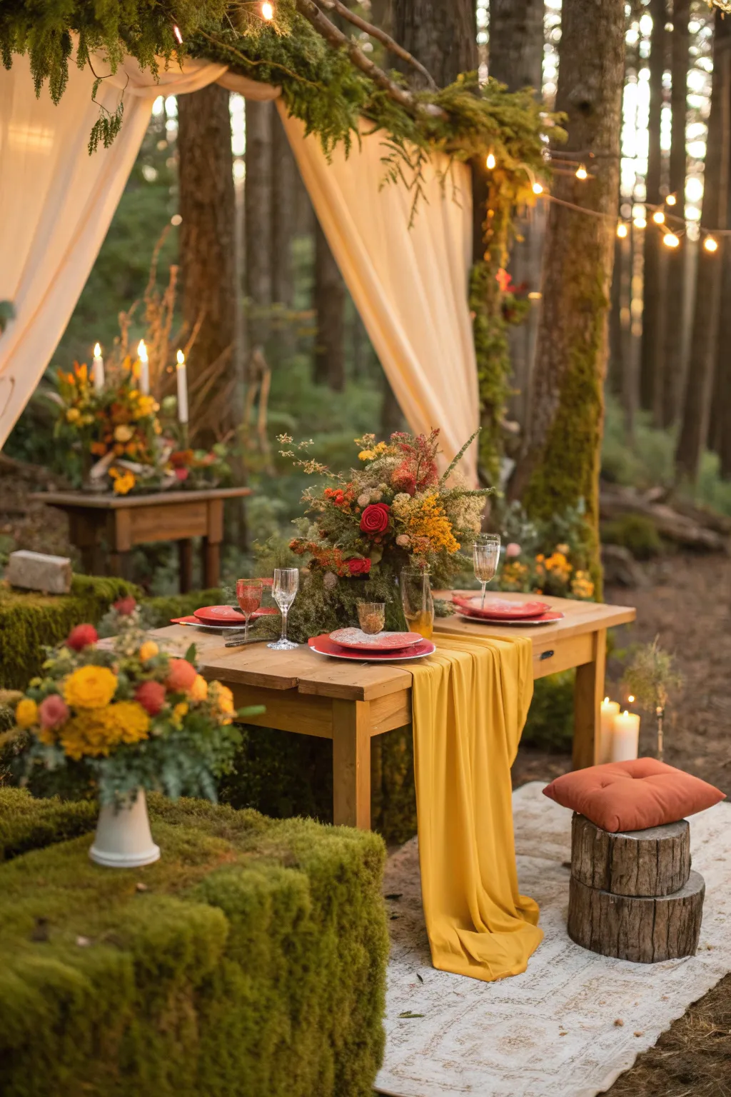Craft centerpieces with vibrant wildflowers and moss, sparkling with fairy lights. These arrangements create a focal point that draws everyone into the enchantment.