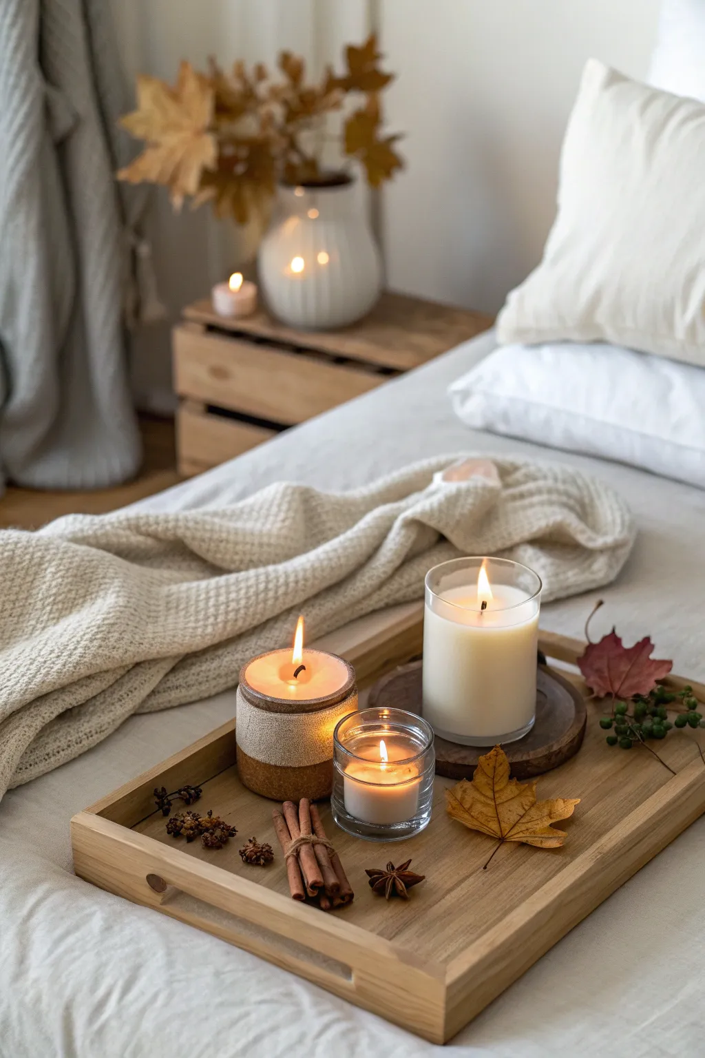 Light up fall scented candles to fill your room with the comforting smells of the season. My personal favorite is a blend of cinnamon and vanilla for that instant cozy vibe.