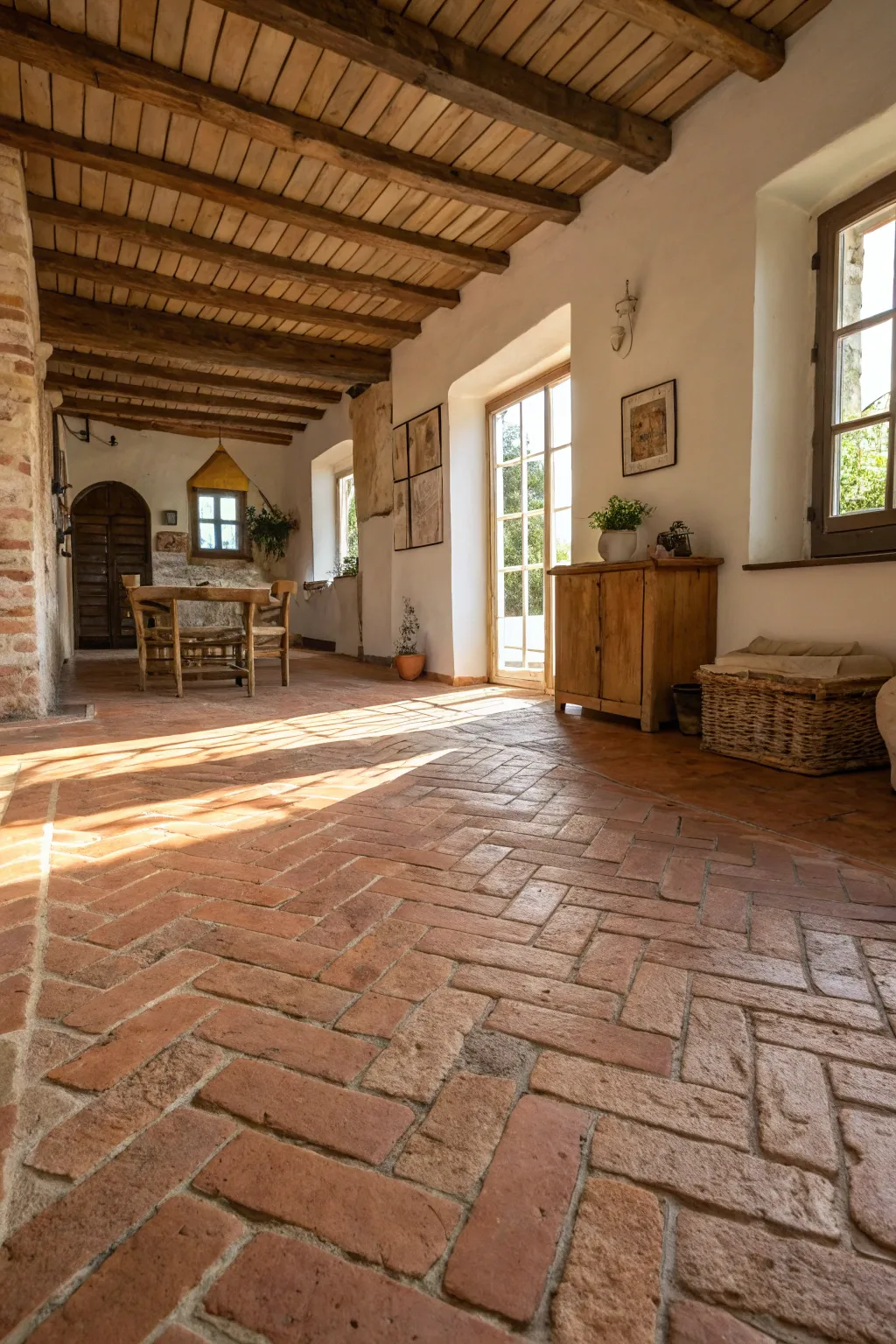 Experiment with brick floor patterns like herringbone for an artistic touch. It’s a simple way to add visual interest and elevate the style of any room.