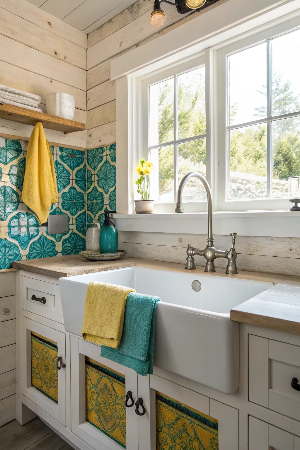 Choose patterned floor tiles to add personality and color. This bold choice complements the simplicity of a farmhouse sink.