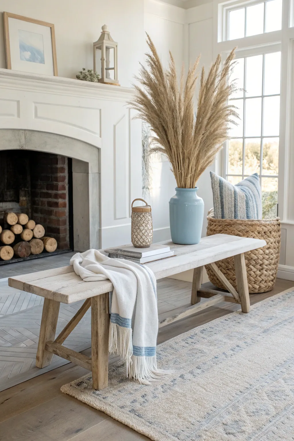 - Whitewashed Wooden Bench: Enhance your living room’s coastal charm with this stylish whitewashed wooden bench for serenity.