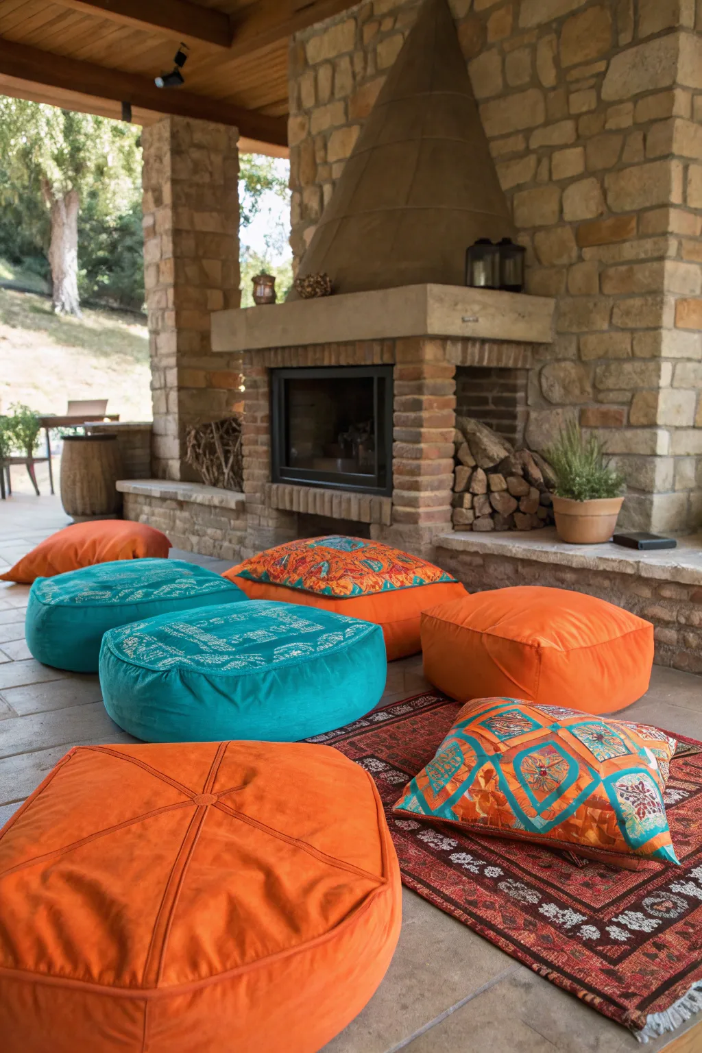 Embrace a laid-back vibe with cozy floor cushions around your fireplace.