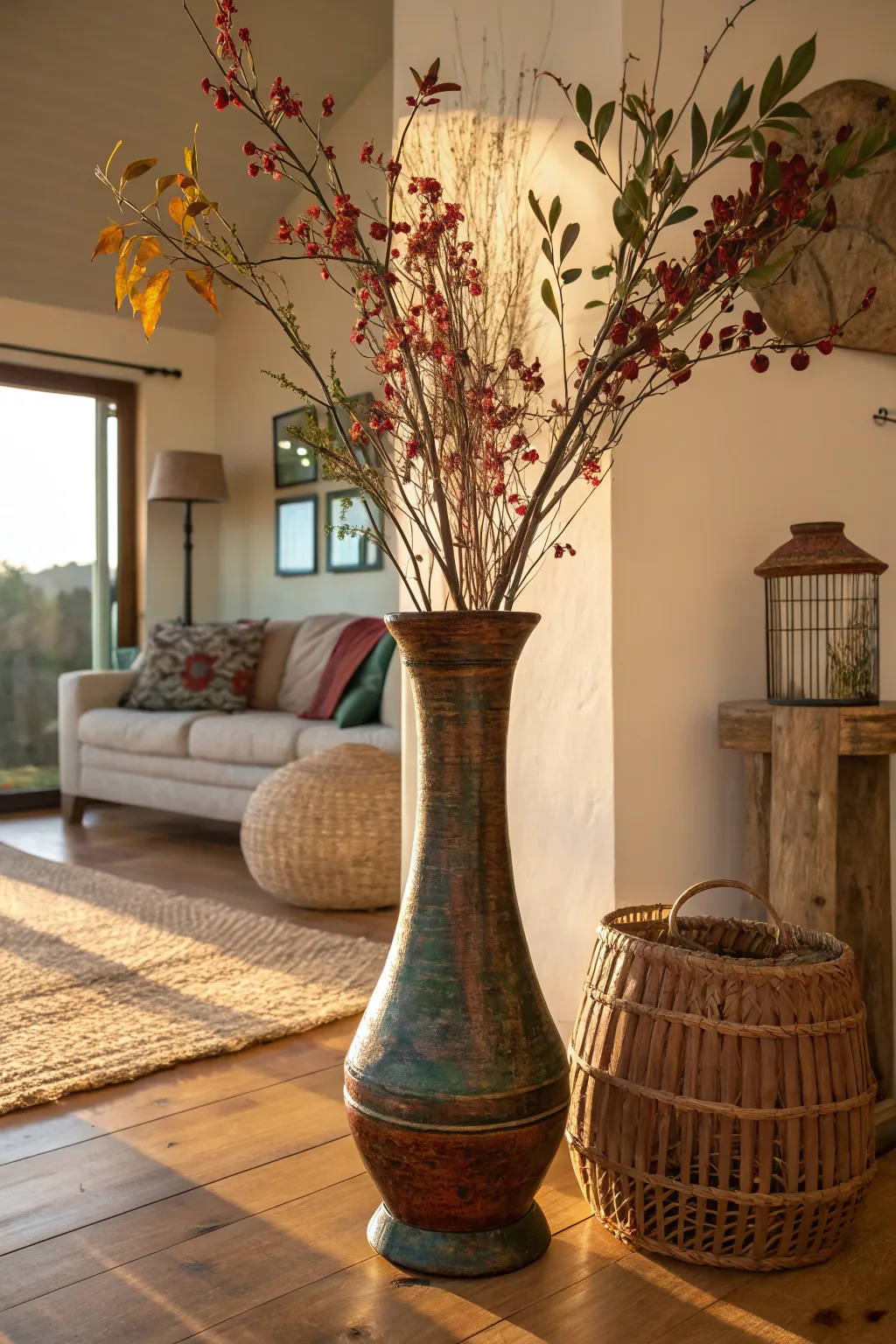 Repurpose vintage containers as floor vases for a touch of nostalgic charm. These pieces add history and character, creating a homely and lived-in feel.