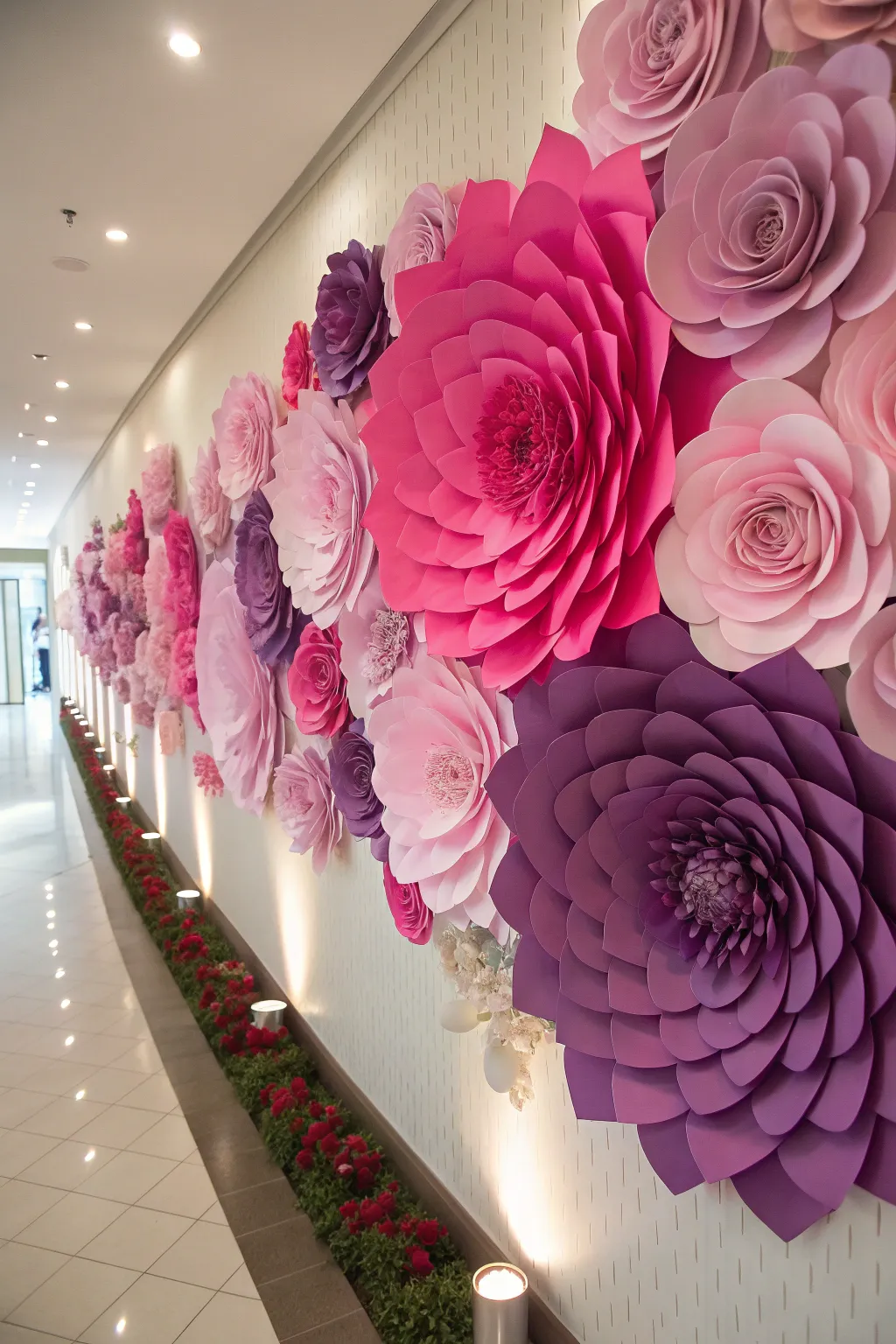 For a playful touch, use jumbo paper flowers to create a dramatic and budget-friendly wall. It’s perfect for children’s parties or whimsical events.