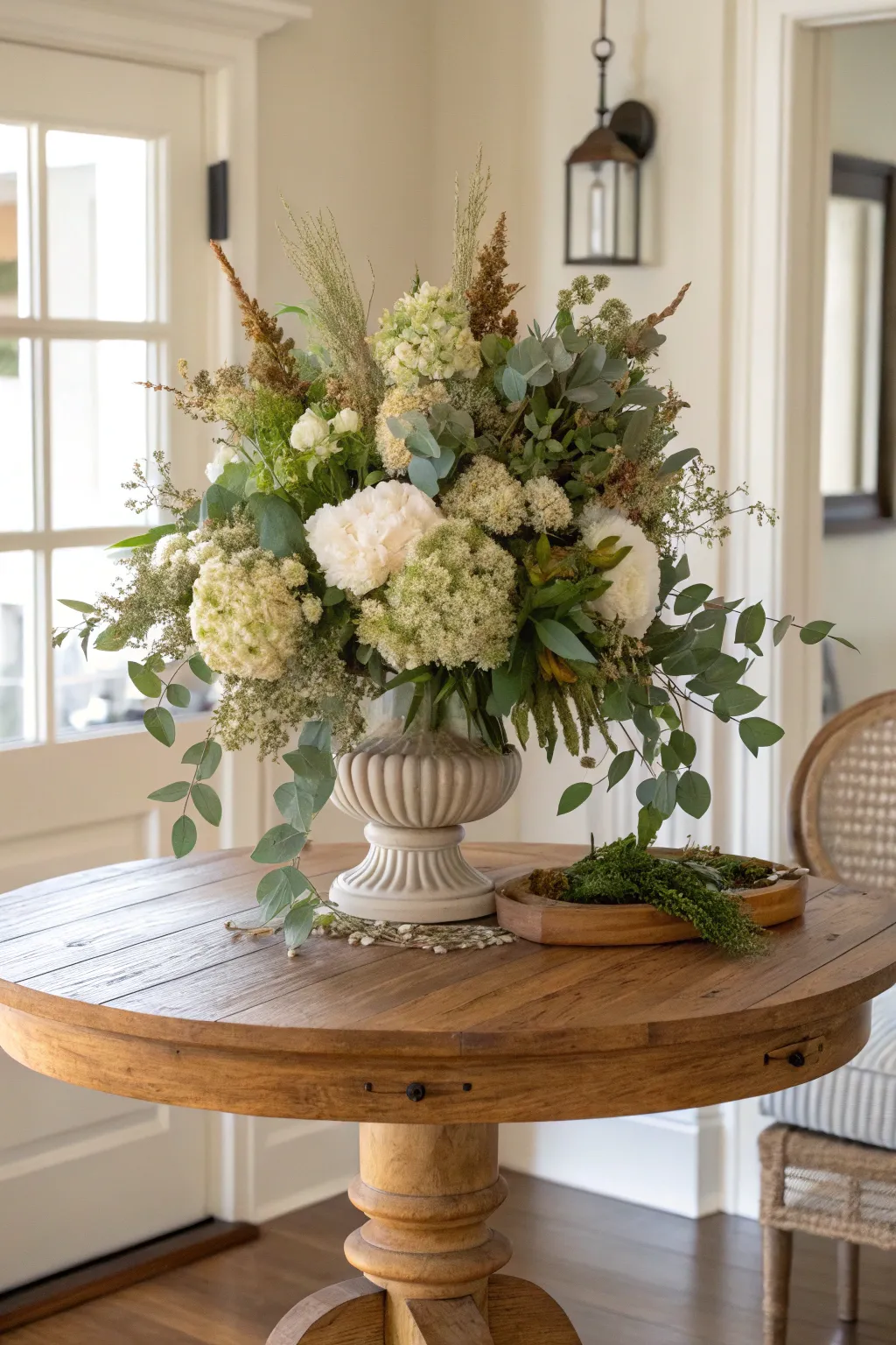 A large, lush floral arrangement can instantly breathe life into your entryway. Personally, I love mixing seasonal blooms with greenery for a fresh and welcoming vibe.