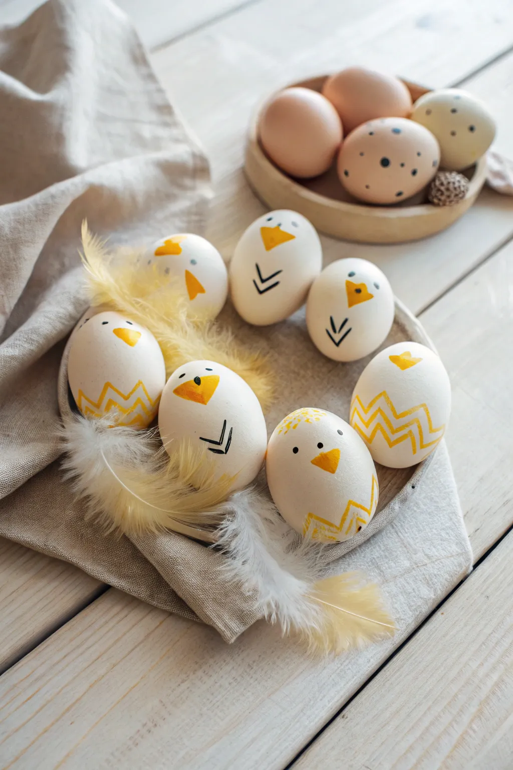 Add feathers and paint beaks to your eggs to create cheerful chick designs. These little guys are a classic favorite at my Easter table.