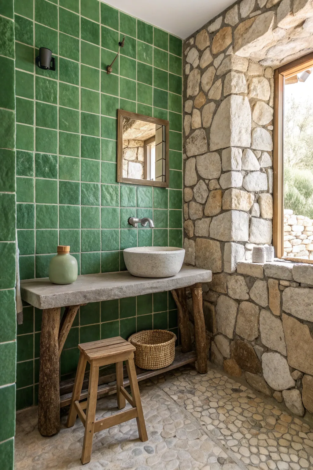 Stone tiles paired with green create a natural, earthy look. I find this combination grounding and perfect for a nature-inspired bathroom.