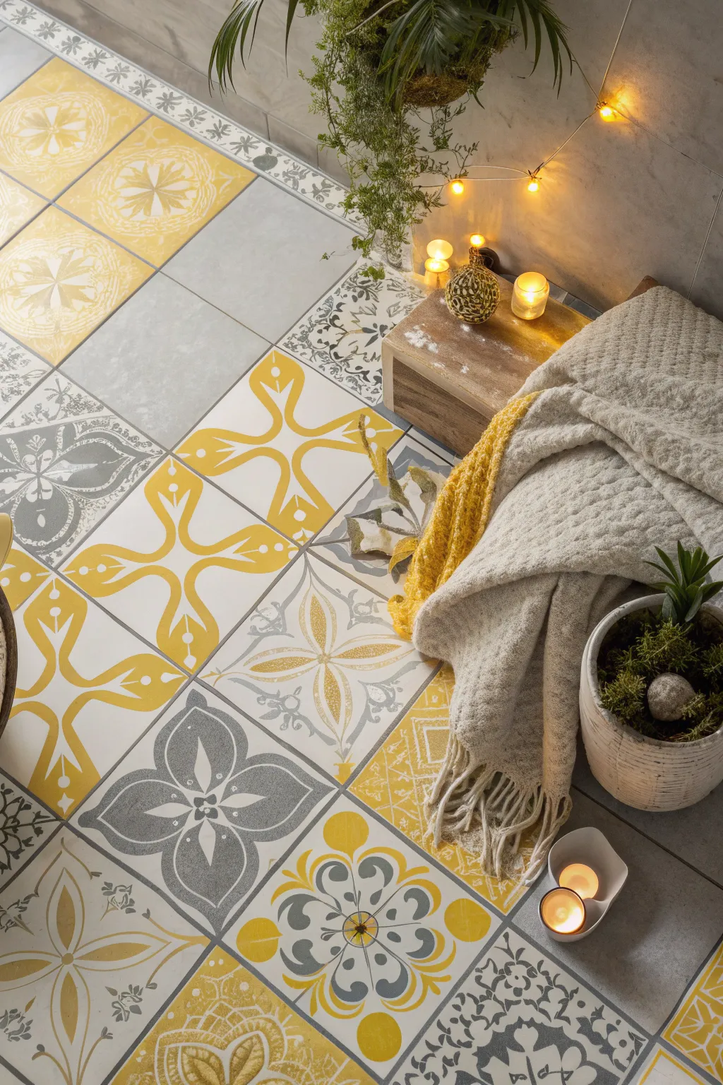 • Decorative Yellow and Grey Vinyl Tiles: Choose these vinyl tiles for a durable and stylish foundation in any room.