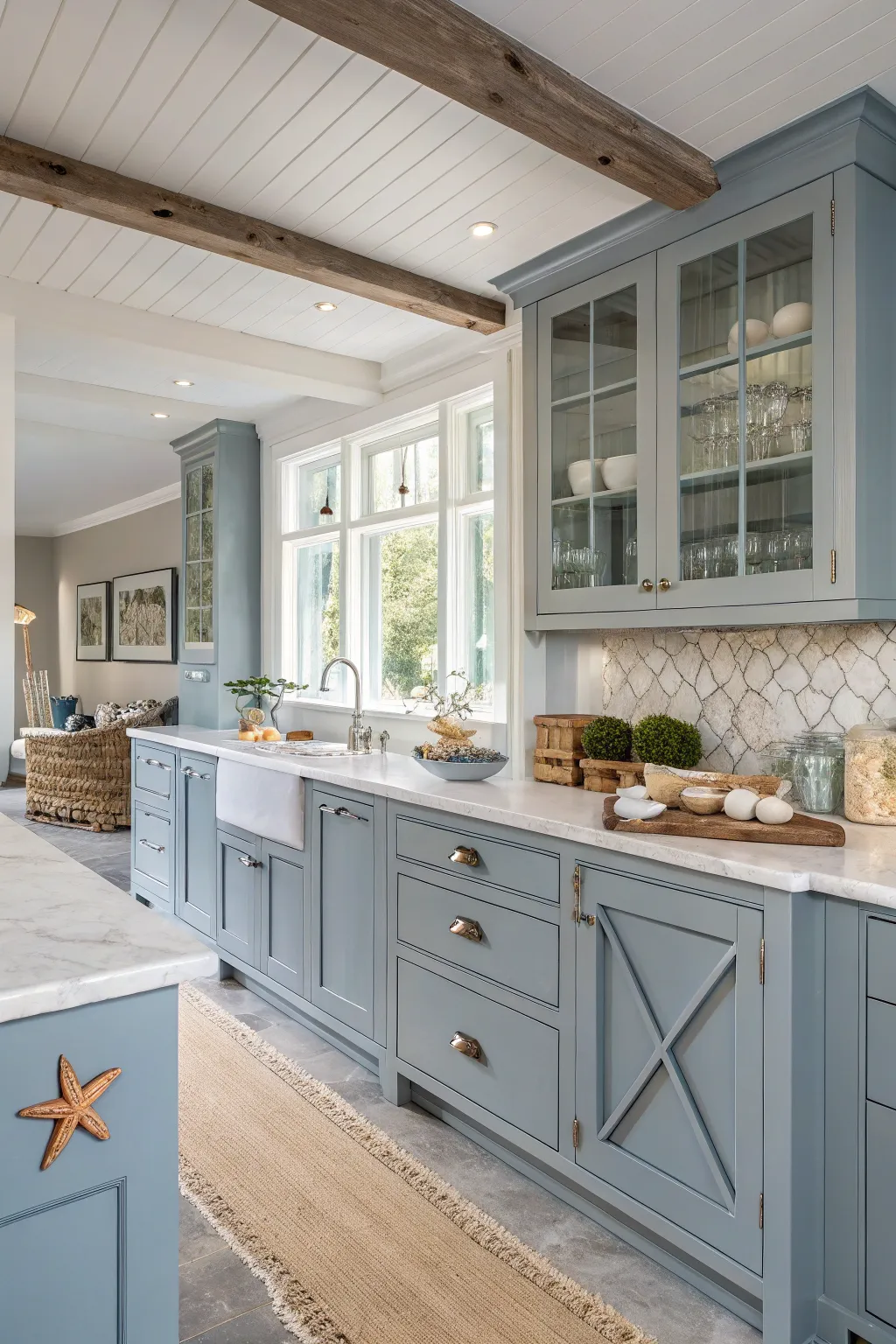 Introduce coastal accents like seashell decor or nautical elements to evoke a breezy, beach-inspired feel. This approach complements the serene tones of grey blue cabinets perfectly.