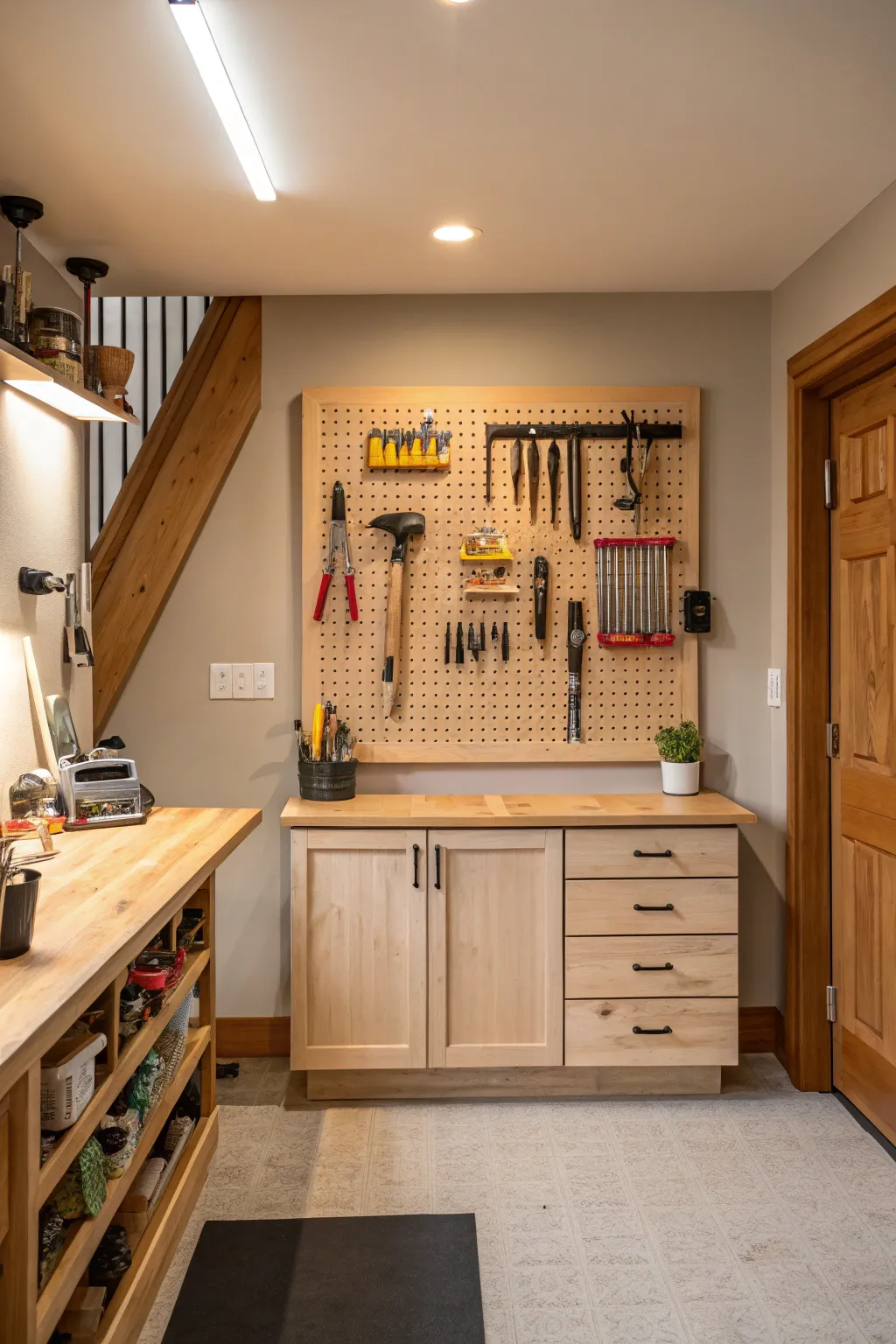 - Pegboard Storage System: Maximize wall space with a pegboard storage system; keep tools accessible and well-arranged.