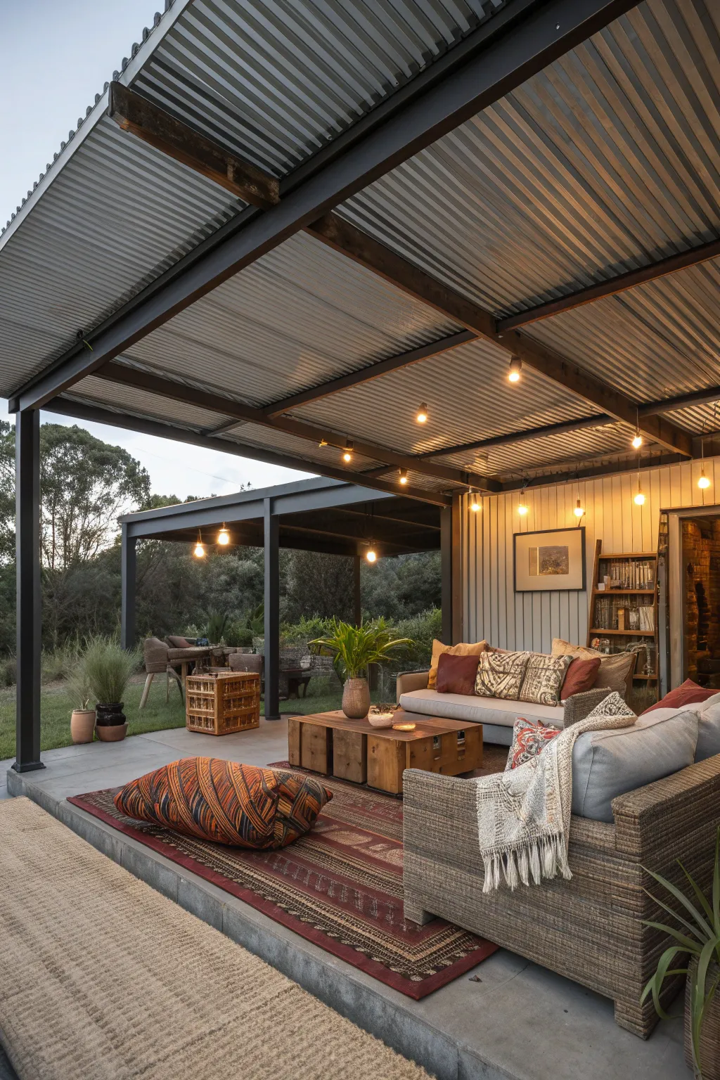 Extend your living space outdoors with a corrugated metal ceiling in a covered patio or porch. It provides shelter while adding an industrial aesthetic to your outdoor retreat. 🌿 #OutdoorLiving #PatioDesign