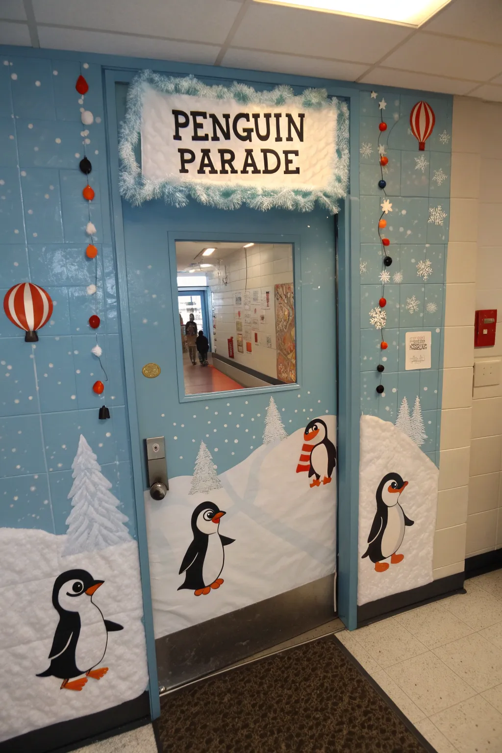 Create a playful scene with a parade of penguins sliding and waddling across your classroom door. These charming creatures are always a hit with students and bring smiles all around.
