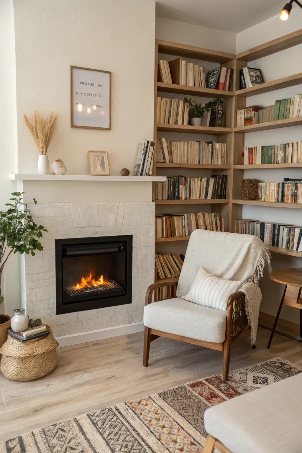 Nothing beats the comfort of reading by a fireplace. If possible, integrate a small electric fireplace for warmth and ambiance in your library.