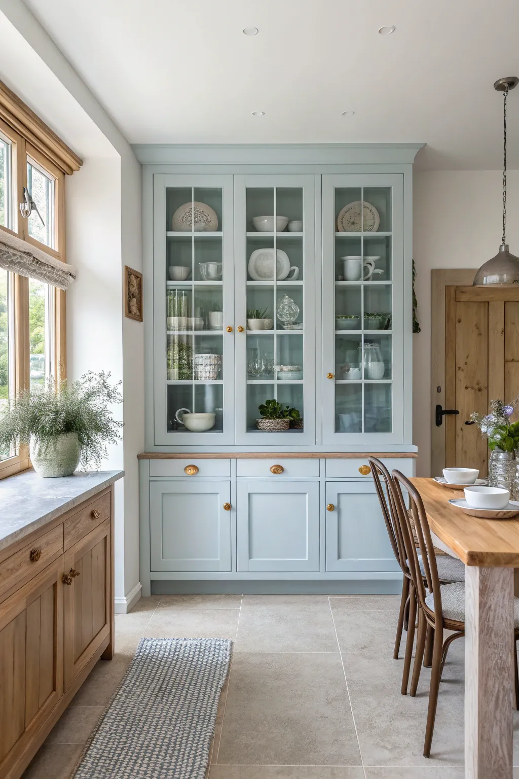 Glass-front cabinets add elegance and openness to light blue kitchens.