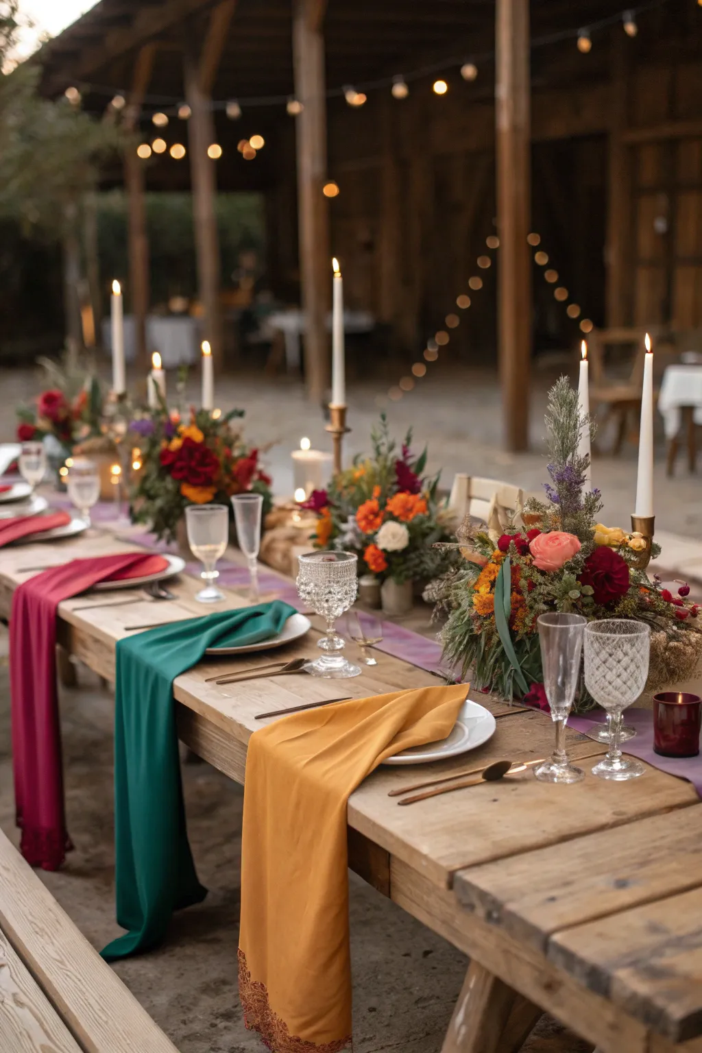 Brighten your table with colorful linens that complement your wedding palette. A pop of color can lift the entire setting, just like the vibrant textiles I love using at home.