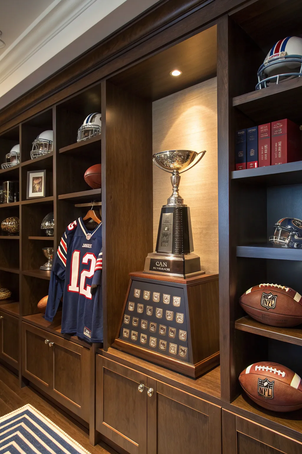 Use shelves to show off your sports memorabilia, creating a shrine to your favorite teams. In one project, I included a trophy shelf that instantly became a conversation starter.