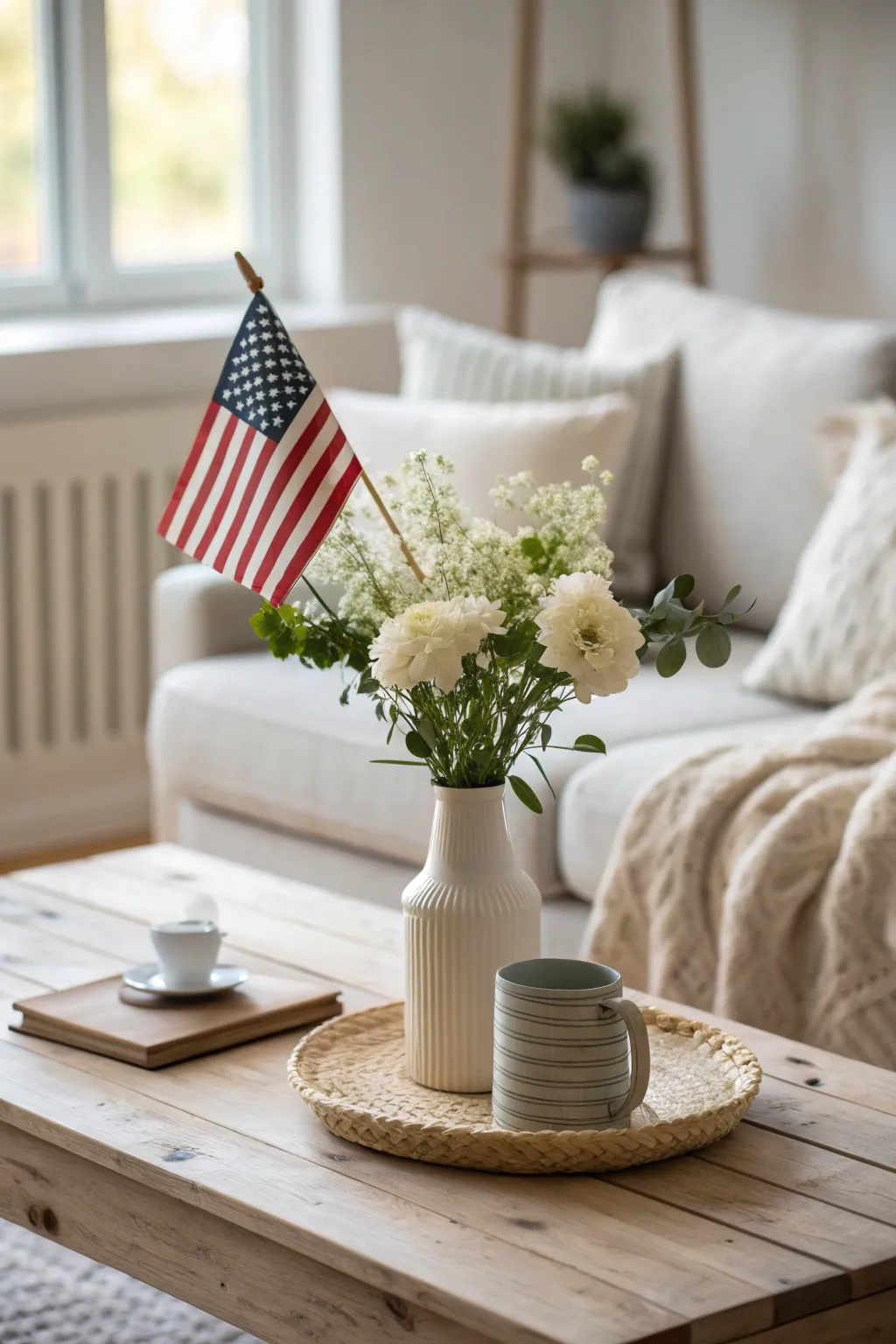 Place small American flags throughout your home for subtle patriotic touches. I like to tuck them into floral arrangements or line the walkway for a festive vibe. 🇺🇸